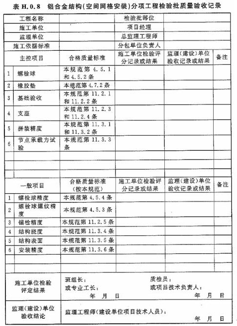 H.0.8 鋁合金結(jié)構(gòu)(空間網(wǎng)格安裝)分項工程檢驗批質(zhì)量驗收應(yīng)按表H.0.8進行記錄。GB 50576-2010 鋁合金結(jié)構(gòu)工程施工質(zhì)量驗收規(guī)范 (免費下載)