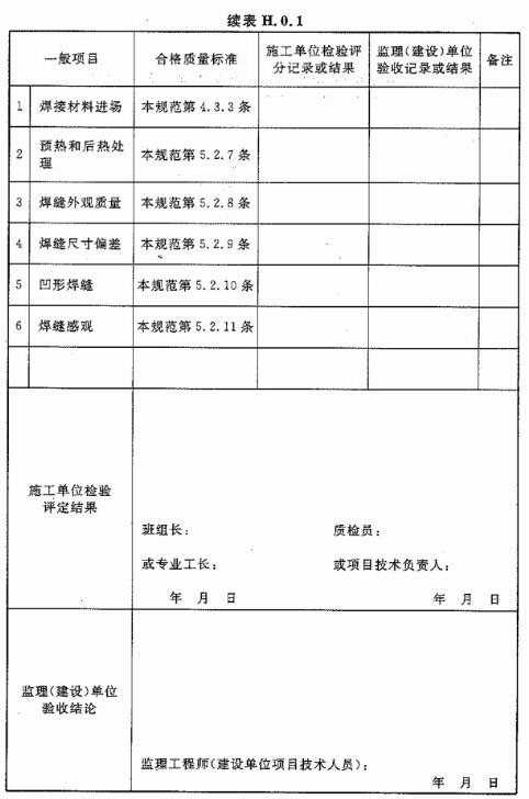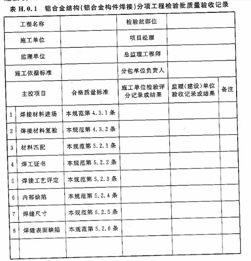 H.0.1 鋁合金結(jié)構(gòu)(鋁合金構(gòu)件焊接)分項工程檢驗批質(zhì)量驗收應(yīng)按表H.0.1進行記錄。資料庫_工程咨詢_工程資料