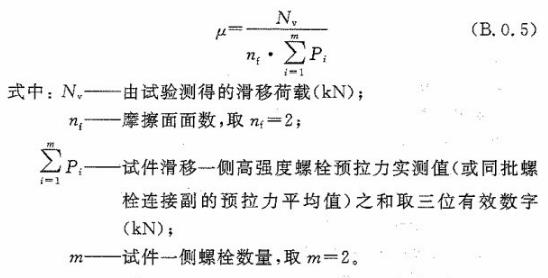 4 抗滑移系數(shù),應(yīng)根據(jù)試驗所測得的滑移荷載和螺栓預拉力的實測值,按式(B.0.5)計算,宜取小數(shù)點二位有效數(shù)字: GB 50576-2010 鋁合金結(jié)構(gòu)工程施工質(zhì)量驗收規(guī)范 (免費下載)