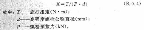 連接副扭矩系數(shù)的復驗應(yīng)將螺栓穿入軸力計,在測出螺栓預拉力的同時,應(yīng)測出施加工螺母上的施扭矩值,并應(yīng)按下式計算扭矩系數(shù)K:GB 50576-2010 鋁合金結(jié)構(gòu)工程施工質(zhì)量驗收規(guī)范 (免費下載)