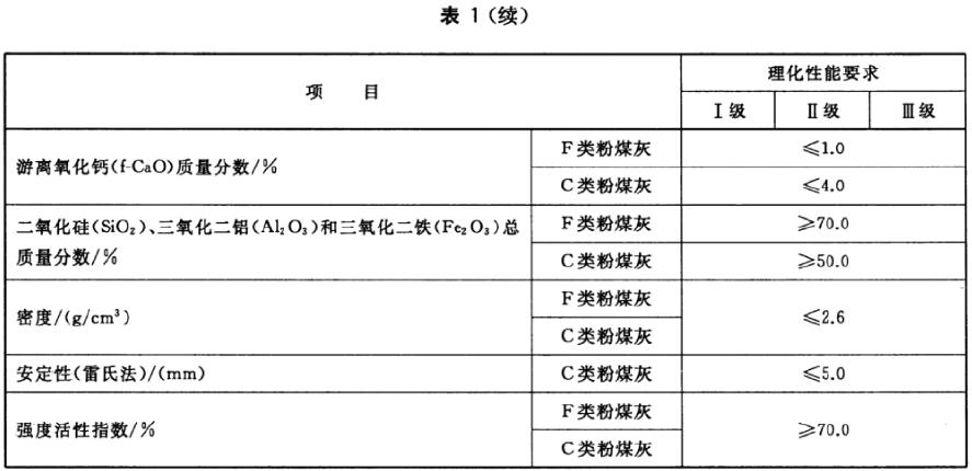 拌制砂漿和混凝土用粉煤灰應(yīng)符合表1要求,水泥活性混合材料用粉煤灰應(yīng)符合表2要求。