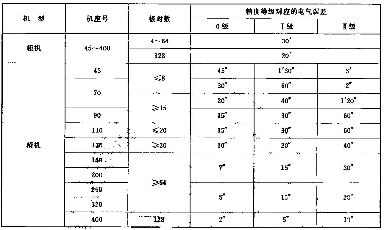 對XFS型和XBS型電機,當極對數p≤8時,粗、精機零位偏差應在±60′(機械角,下同)范圍內;當極對數8<p≤64時,粗、精機零位偏差應在士30′(機械角,下同)范圍內;當p≥64時,粗、精機零位偏差應在±20′范圍內。