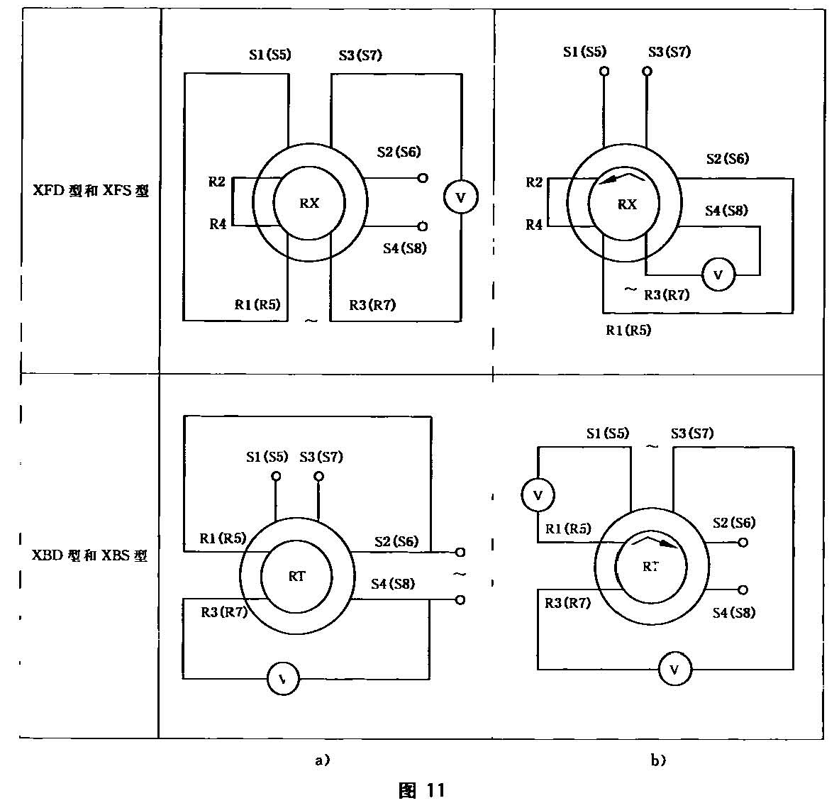 電機安裝在角分度裝置上,按圖1la)接線,額定勵磁,先檢查粗機接線正確性,轉動轉子使相敏電壓表讀數最小,對于XFD型和XFS型電機,確認R1、R3;S1、S3;對于XBD型和XBS型電機,確認S2、S4;R1、R3;再按圖11b)接線,額定勵磁,對于XFD型和XFS型電機,當轉子正向旋轉電氣角度90°時,電壓表讀數由大逐漸減小,則接線正確。對于XBD型和XBS型電機當轉子反向旋轉電氣角度90°時,電壓表讀數由大逐漸減小,則接線正確.