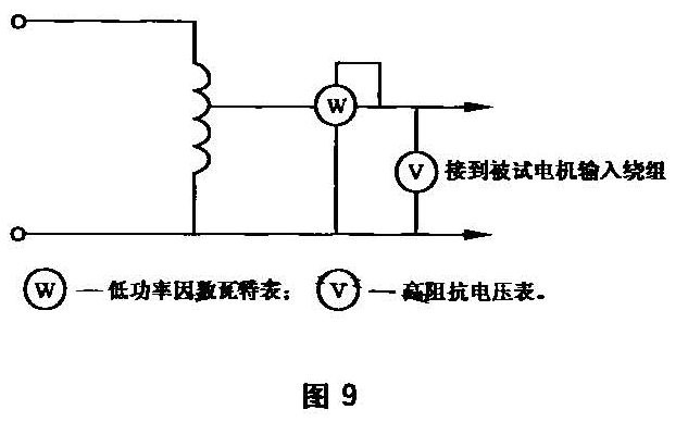 按圖9接線,被試電機輸入繞組額定勵磁,輸出繞組開路(對XBD型和XBS型電機輸入繞組一相勵磁,另一相短路)分別測量粗、精機的消耗功率應符合4.18的要求。