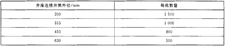 按同一原料、配方和工藝情況下生產(chǎn)同一規(guī)格的檢查井井座為一批,每批數(shù)量按表10確定。如生產(chǎn)數(shù)量少,生產(chǎn)期20d尚不足表10中數(shù)量時(shí),則以20d產(chǎn)量為一批。