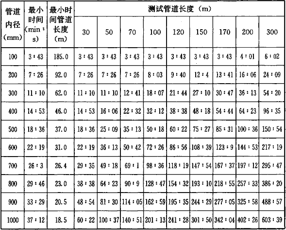 注:表中對于管道長度值可以采取插值法獲取其他長度的最小允許時間;對于管道直徑不可以采取插值法。