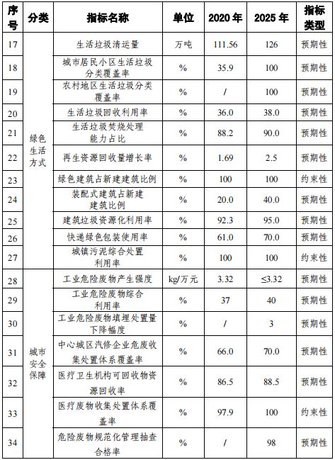 規(guī)劃指標(biāo):本規(guī)劃目標(biāo)基準(zhǔn)年為2020年,共設(shè)置7大類合計(jì)51項(xiàng)指標(biāo),其中約束性指標(biāo)8項(xiàng),預(yù)期性指標(biāo)43項(xiàng)。具體指標(biāo)情況如下表所示。