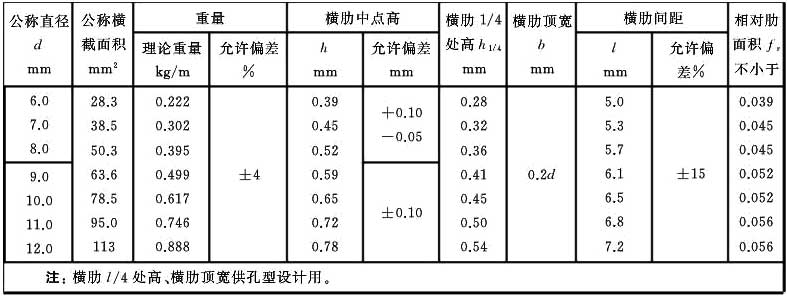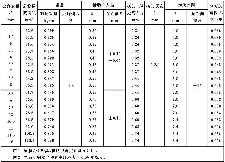 二面肋和三面肋鋼筋的尺寸、重量及允許偏差應(yīng)符合表1的規(guī)定。