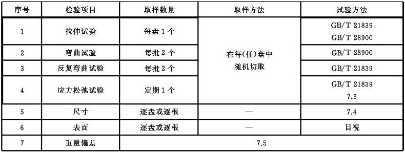 鋼筋出廠檢驗(yàn)的檢驗(yàn)項(xiàng)目、取樣數(shù)量、取樣方法、試驗(yàn)方法應(yīng)符合表5的規(guī)定。