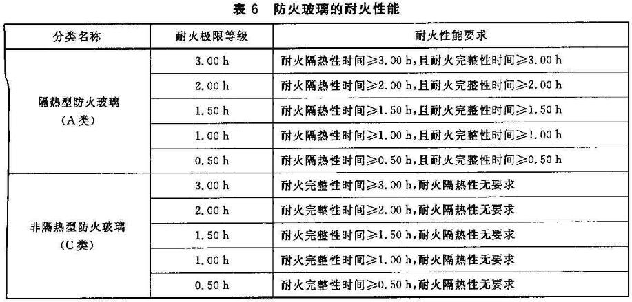 隔熱型防火玻璃(A類)和非隔熱型防火玻璃(C類)的耐火性能應(yīng)滿足表6的要求。