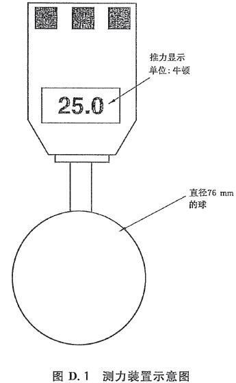 測(cè)力裝置應(yīng)包括一個(gè)直徑為(76±1)mm的球體,球體通過(guò)臂桿連接在推力測(cè)量和顯示裝置上,能夠測(cè)量出施加的最大力25N,儀器測(cè)量精度至少0.1N。測(cè)力裝置的樣式可見(jiàn)圖D.1。