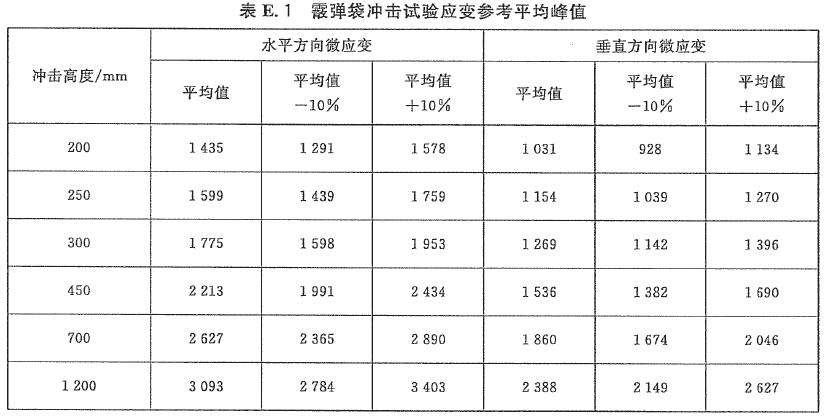 在被校準(zhǔn)的框架上獲得的沖擊高度與應(yīng)變的曲線(xiàn),應(yīng)在下述參照校準(zhǔn)曲線(xiàn)的±10%以?xún)?nèi)(見(jiàn)表E.1和圖E.1)。滿(mǎn)足上述要求的框架,才能用于霰彈袋沖擊分級(jí)試驗(yàn),使用該框架對(duì)試樣所進(jìn)行的霰彈袋沖擊試驗(yàn)獲得的級(jí)別結(jié)果有效。使用校準(zhǔn)曲線(xiàn)達(dá)不到要求的試驗(yàn)框架進(jìn)行霰彈袋沖擊試驗(yàn)獲得的沖擊級(jí)別無(wú)效。