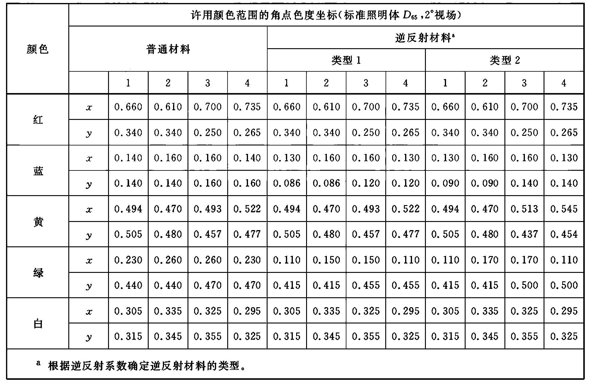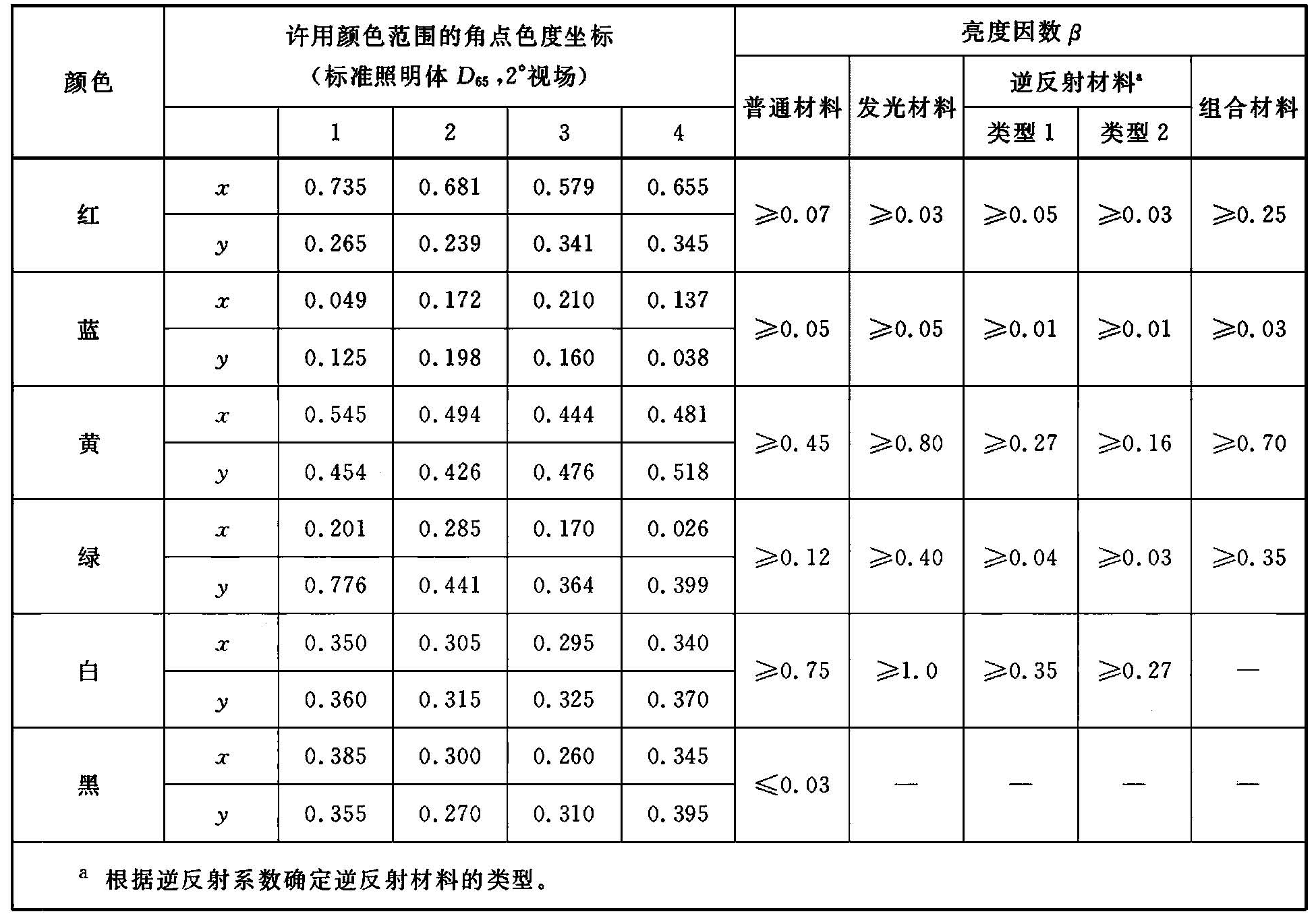 表2 普通材料、發(fā)光材料、逆反射材料和組合材料的色度坐標(biāo)和亮度因數(shù)
