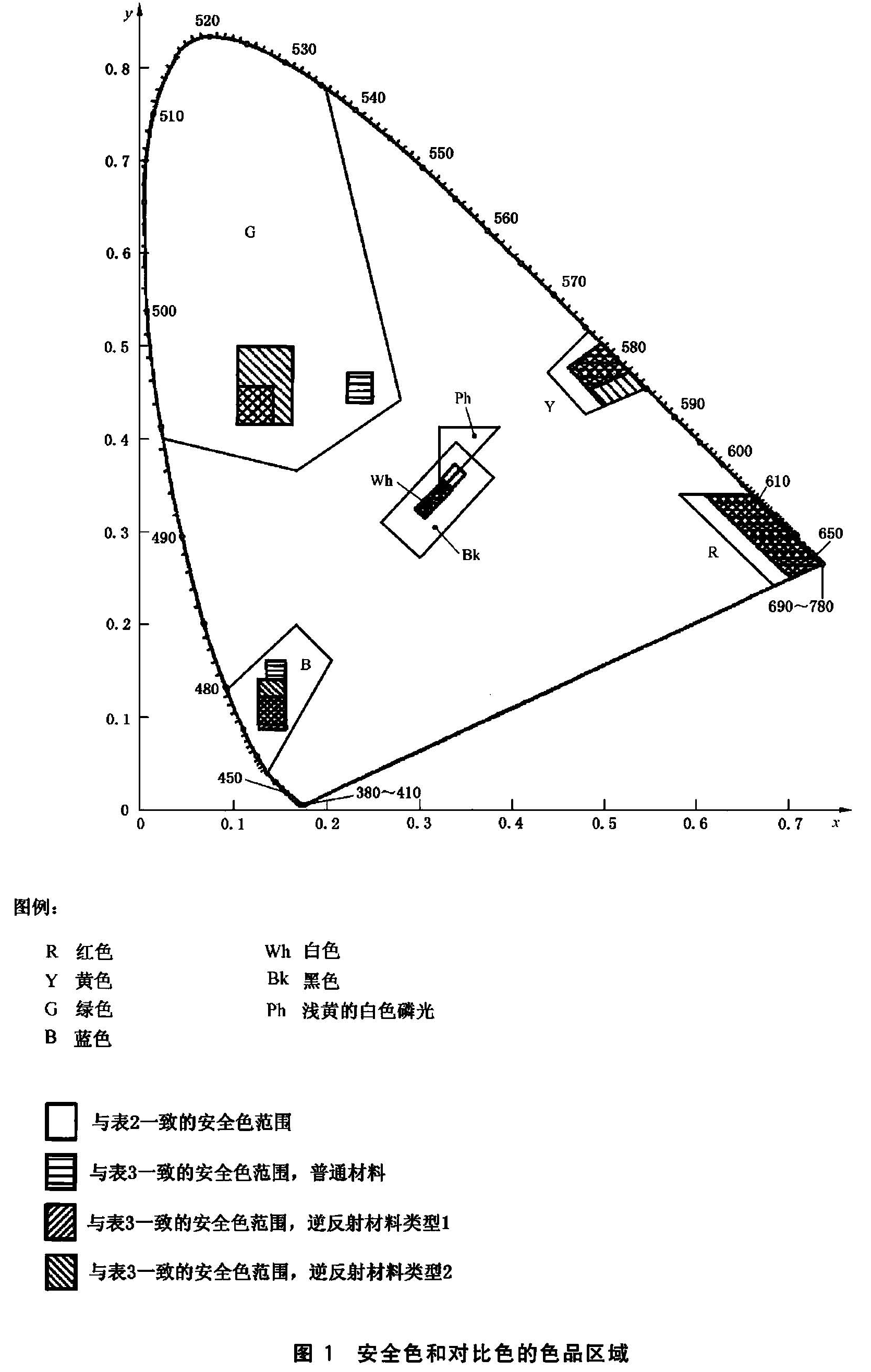安全色的色度范圍應(yīng)如圖1和表2所示。