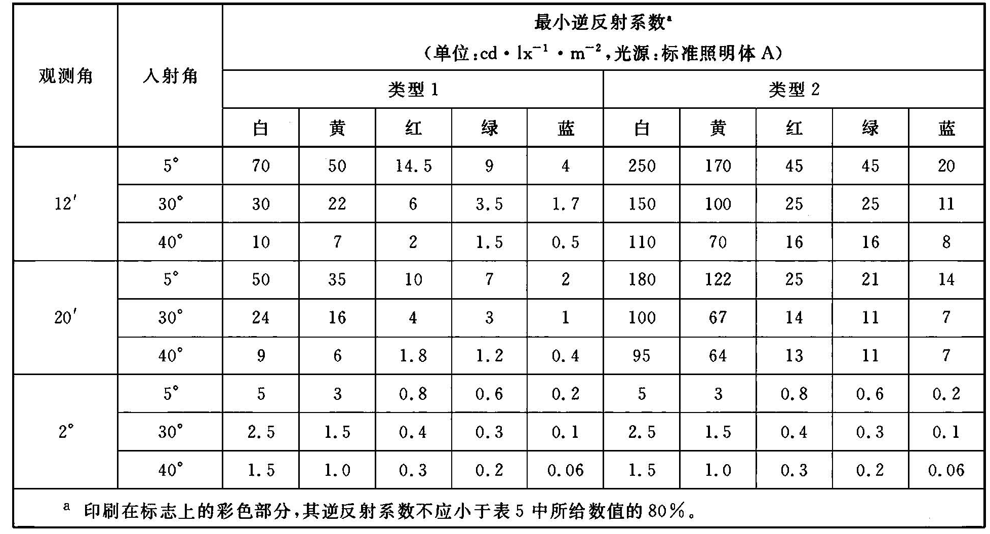 含有逆反射材料的最小逆反射系數(shù)如表5所示。