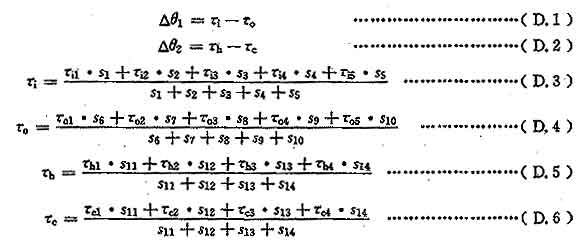 熱箱外壁內(nèi)、外表面面積加權(quán)平均溫度之差△θ1及試件框熱側(cè)、冷側(cè)表面面積加權(quán)平均溫度之差△θ2,按式(D.1)~式(D.6)進(jìn)行計(jì)算: