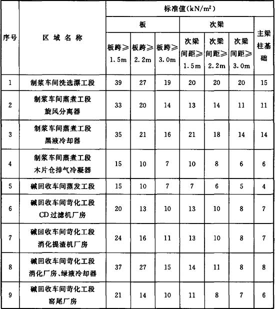 表D.0.1 制漿車間、堿回收車間梁板安裝檢修等效荷載