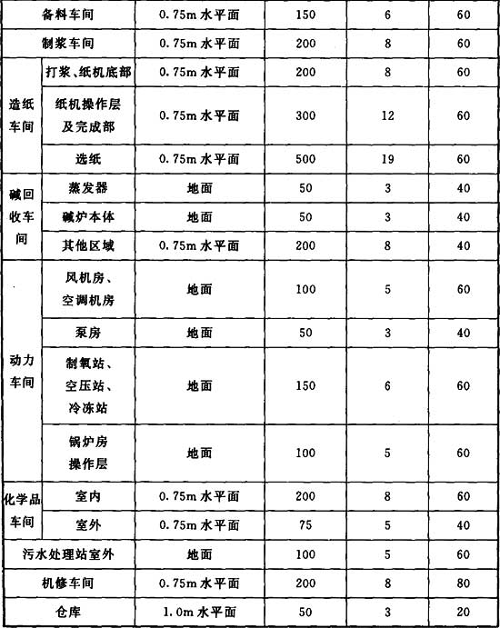 表E 制漿造紙廠各生產(chǎn)車間和工作場所設(shè)計(jì)照明系統(tǒng)的照度標(biāo)準(zhǔn)值