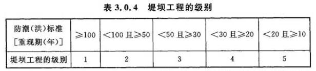 3.0.4堤壩工程的級別應(yīng)根據(jù)其防潮(洪)標(biāo)準(zhǔn)按表3.0.4確定。