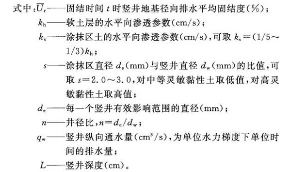 2當(dāng)排水豎井采用擠土方式施工時,應(yīng)計入涂抹對土體固結(jié)的影響。當(dāng)豎井的縱向通水量qw與天然土層水平向滲透系數(shù)屜。的比值較小,且長度又較長時,尚應(yīng)計入井阻影響。徑向和一級或多級等速加載條件下的平均固結(jié)度可按下列公式計算: