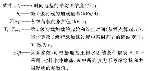 1一級或多級等速加載條件下,當(dāng)固結(jié)時間為t時,對應(yīng)總荷載的地基平均固結(jié)度可按下式計算: