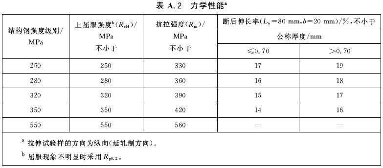 A.2 熱鍍鋅、鋁鋅基板的力學性能應符合表A.2的規(guī)定。