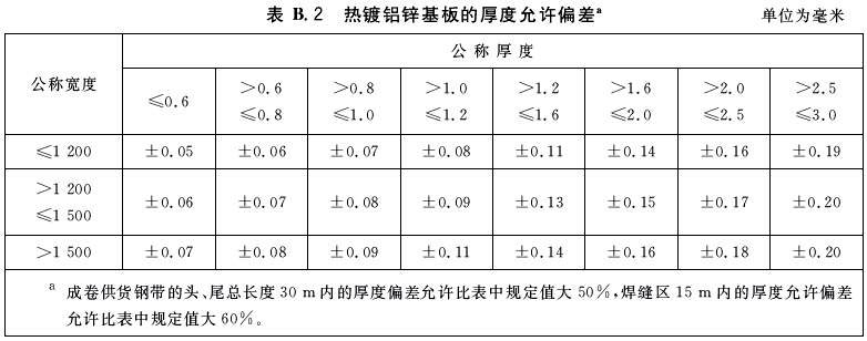 附錄B 熱鍍鋅、熱鍍鋁鋅基板厚度的允許偏差