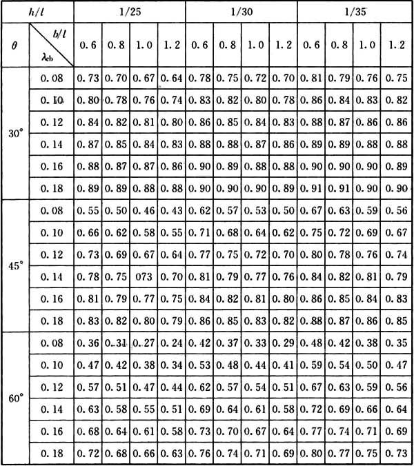 注:h為升板結(jié)構(gòu)樓板厚度,當(dāng)為密肋扳時(shí),取慣性矩相等的折算平均厚度;b為等代框架梁的計(jì)算寬度;θ為柱帽傾斜側(cè)面與柱軸線的交角;λcb為柱帽半寬與等代框架梁跨度之比。
