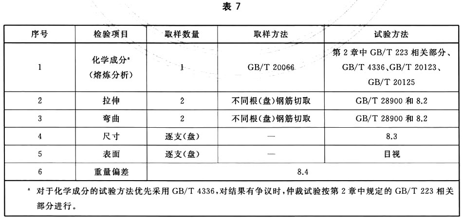 每批鋼筋的檢驗(yàn)項(xiàng)目、取樣數(shù)量、取樣方法和試驗(yàn)方法應(yīng)符合表7的規(guī)定。