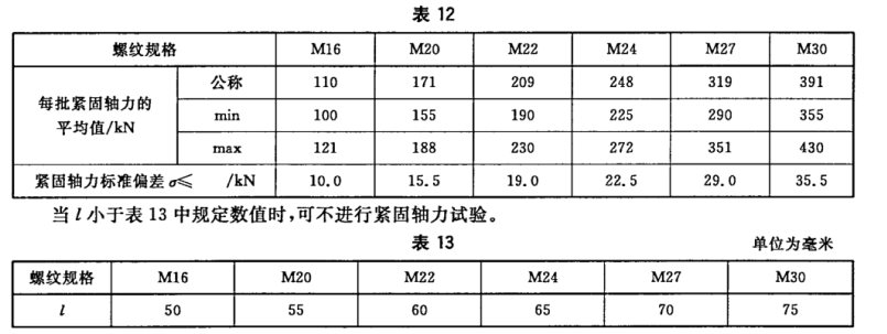 為保證連接副緊固軸力和防銹性能,螺栓、螺母和墊圈應(yīng)進(jìn)行表面處理(可以是相同的或不同的),并由制造者確定,經(jīng)處理后的連接副緊固軸力應(yīng)符合表12的規(guī)定。