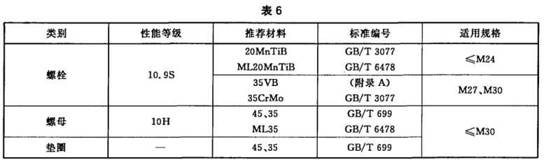 螺栓、螺母、墊圈的性能等級(jí)和推薦材料按表6的規(guī)定。經(jīng)供需雙方協(xié)議,也可使用其他材料,但應(yīng)在訂貨合同中注明,并在螺栓或螺母產(chǎn)品上增加標(biāo)志T(緊跟S或H)。