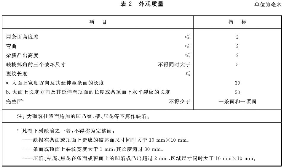磚的外觀質(zhì)量應(yīng)符合表2的規(guī)定。
