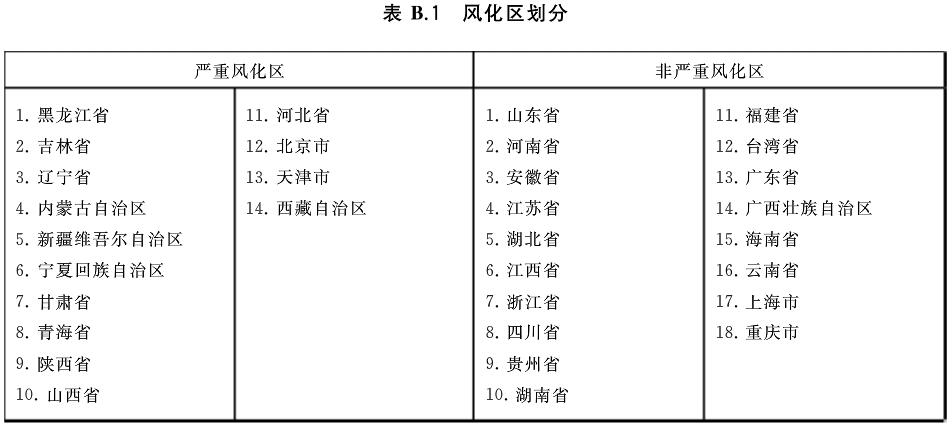 B.3 風(fēng)化指數(shù)大于或等于12700為嚴(yán)重風(fēng)化區(qū),風(fēng)化指數(shù)小于12700為非嚴(yán)重風(fēng)化區(qū)。全國風(fēng)化區(qū)劃分見表B.1。