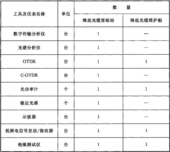 11.0.2 維護(hù)工具及儀表的配置應(yīng)能滿足系統(tǒng)日常運(yùn)行維護(hù)的需要,儀表的型號(hào)和功能應(yīng)根據(jù)其價(jià)格和實(shí)用性擇優(yōu)選用。海底光纜系統(tǒng)維護(hù)工具及儀表可按表11.0.2配置。