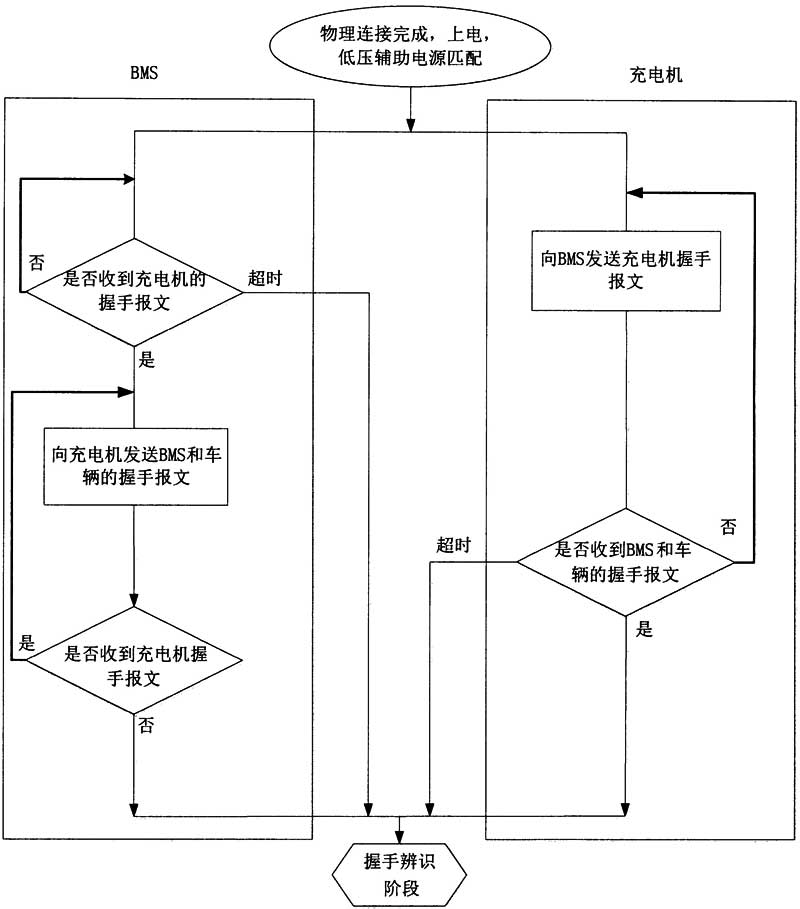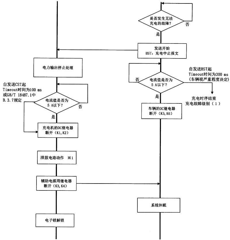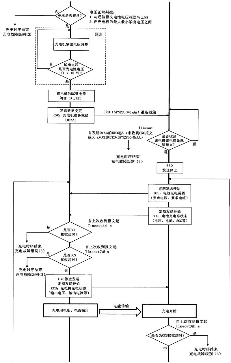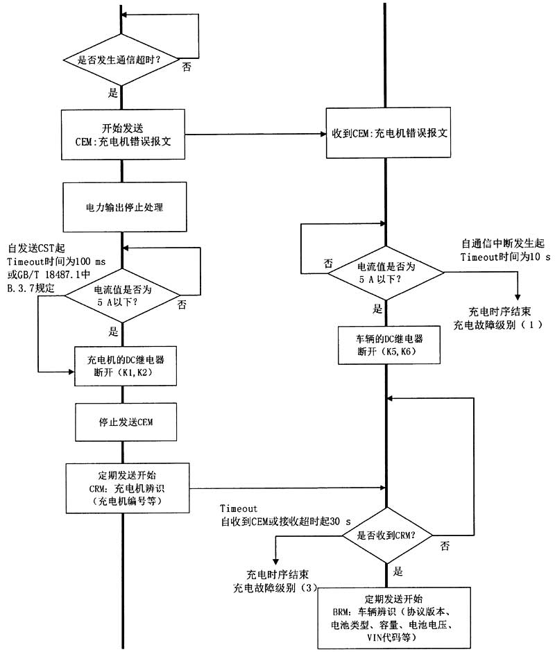 注2:當充電機檢測到充電故障時,立即發(fā)送CST(充電機中止充電)命令,同時充電機停機,停止CAN通信,切斷K1、K2、K3、K4等開關,根據故障類型進入相應的處理方式。在處理方式c)下,當充電機自檢到故障消除時,重新由充電機發(fā)起握手辨識階段的連接,進行充電。如果重新連接3次仍未成功,則按照處理方式b),需操作人員查看當前狀況并重新插拔充電連接器,嘗試再次充電。