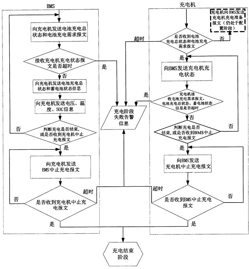 充電配置階段完成后,充電機和BMS進入充電階段。在整個充電階段,BMS實時向充電機發(fā)送電池充電需求,充電機根據電池充電需求來調整充電電壓和充電電流以保證充電過程正常進行。在充電過程中,充電機和BMS相互發(fā)送各自的充電狀態(tài)。除此之外,BMS根據要求向充電機發(fā)送動力蓄電池具體狀態(tài)信息及電壓、溫度等信息。BMV,BMT,BSP為可選報告,充電機不對其進行報文超時判定。