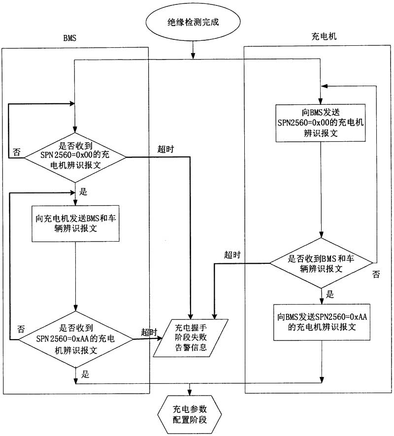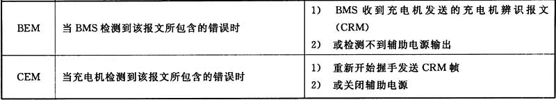注1:BMS檢測到故障后,根據故障程度,選擇在BSM(動力蓄電池狀態(tài)信息)報文或BST(BMS中止充電)報文中提供停止充電信息,使充電機停機,進入處理方式b);或是將BSM報文中SPN3090~SPN3095均置為00(電池狀態(tài)正常),且SPN3096置為00(禁止充電),使充電機暫停輸出電流,此時BMS和充電機進行正常通信,直到等待BMS發(fā)送的BSM報文中SPN3096為01(允許充電)后,重新允許充電機電流輸出,如果等待時間超過10min,充電機中止充電,并保存中止充電原因。