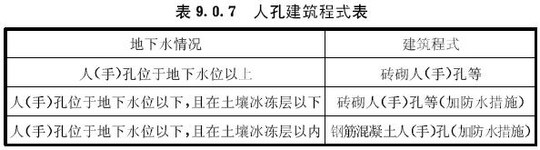 9.0.7根據(jù)地下水位情況,人(手)孔的建筑程式可按表9.0.7的規(guī)定確定。大牛工程師