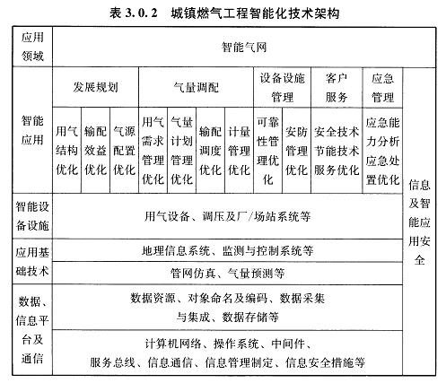 3.0.1城鎮(zhèn)燃?xì)夤こ讨悄芑瘧?yīng)根據(jù)供應(yīng)規(guī)模、客戶需求、輸配系統(tǒng)工藝、運(yùn)行安全等要求進(jìn)行整體規(guī)劃,并應(yīng)遵循技術(shù)標(biāo)準(zhǔn)化、信息一體化、功能模塊化的建設(shè)原則。3.0.2城鎮(zhèn)燃?xì)夤こ讨悄芑夹g(shù)應(yīng)包括數(shù)據(jù)、信息平臺(tái)及通信、應(yīng)用基礎(chǔ)技術(shù)、智能設(shè)備設(shè)施、智能應(yīng)用,以及信息及智能應(yīng)用的安全。智能應(yīng)用應(yīng)涵蓋城鎮(zhèn)燃?xì)夤?yīng)系統(tǒng)的發(fā)展規(guī)劃、氣量調(diào)配、設(shè)備設(shè)施管理、客戶服務(wù)和應(yīng)急管理。城鎮(zhèn)燃?xì)夤こ讨悄芑夹g(shù)架構(gòu)可按表3.0.2構(gòu)建。