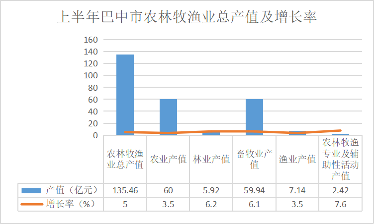 上半年,巴中市農(nóng)林牧漁業(yè)總產(chǎn)值達(dá)135.46億元,按可比價計算增長5%,增速環(huán)比加快0.4個百分點。其中,農(nóng)業(yè)產(chǎn)值為60億元,增長3.5%;林業(yè)產(chǎn)值為5.92億元,增長6.2%;畜牧業(yè)產(chǎn)值為59.94億元,增長6.1%;漁業(yè)產(chǎn)值為7.14億元,增長3.5%;農(nóng)林牧漁專業(yè)及輔助性活動產(chǎn)值為2.42億元,增長7.6%。