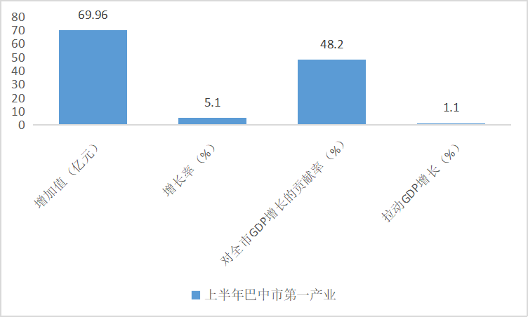 上半年,巴中市第一產(chǎn)業(yè)增加值為69.96億元,增長5.1%,增速較一季度上升1.1個百分點,對全市GDP增長的貢獻率為48.2%,拉動GDP增長1.1個百分點。