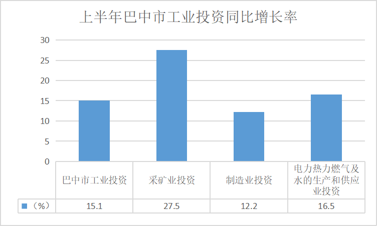 上半年,巴中市工業(yè)投資同比增長(zhǎng)15.1%,增速比一季度回升35.6個(gè)百分點(diǎn),比全省平均增速高6.8個(gè)百分點(diǎn)。其中,采礦業(yè)投資同比增長(zhǎng)27.5%,制造業(yè)投資同比增長(zhǎng)12.2%,電力熱力燃?xì)饧八纳a(chǎn)和供應(yīng)業(yè)投資增長(zhǎng)16.5%。