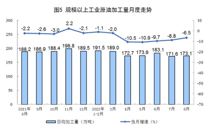 原油加工量降幅有所收窄。8月份,加工原油5366萬噸,同比下降6.5%,降幅比上月收窄2.3個百分點,日均加工173.1萬噸。1—8月份,加工原油43489萬噸,同比下降6.3%。