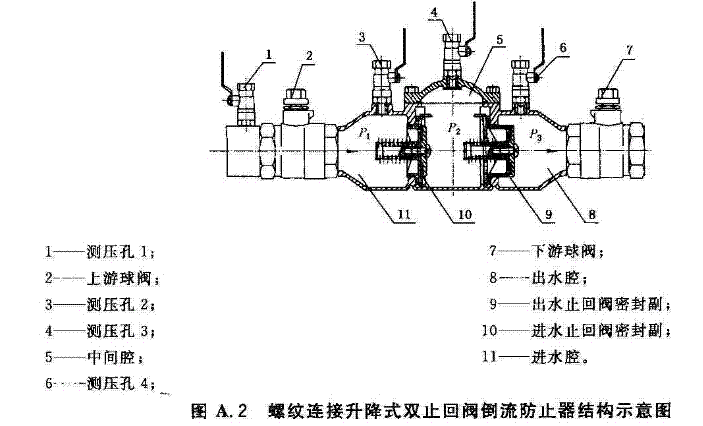 其整體結(jié)構(gòu)主要由兩個獨立止回閥串聯(lián)而成,并應(yīng)符合4.1.3要求,兩個止回閥的閥座密封副將其內(nèi)腔分為進水腔、中間腔和出水腔,本標(biāo)準(zhǔn)將各腔內(nèi)壓力分別命名為P1、P2和P3。