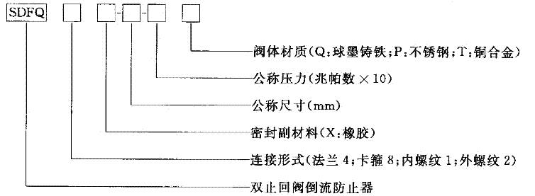 雙止回閥倒流防止器型號編制參照JB/T308,由字母和數(shù)字組成,表示方法如下: