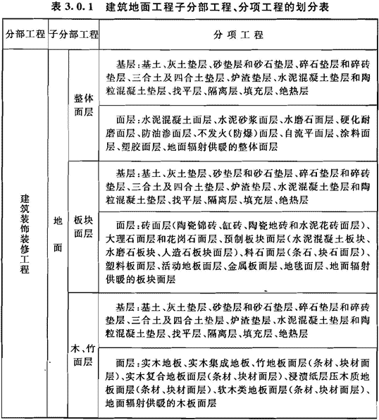 3.0.1 建筑地面工程子分部工程、分項工程的劃分應(yīng)按表3.0.1的規(guī)定執(zhí)行。