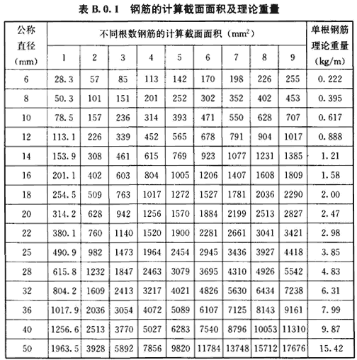B.0.1 鋼筋的計算截面面積及理論重量,應符合表B.0.1的規(guī)定。