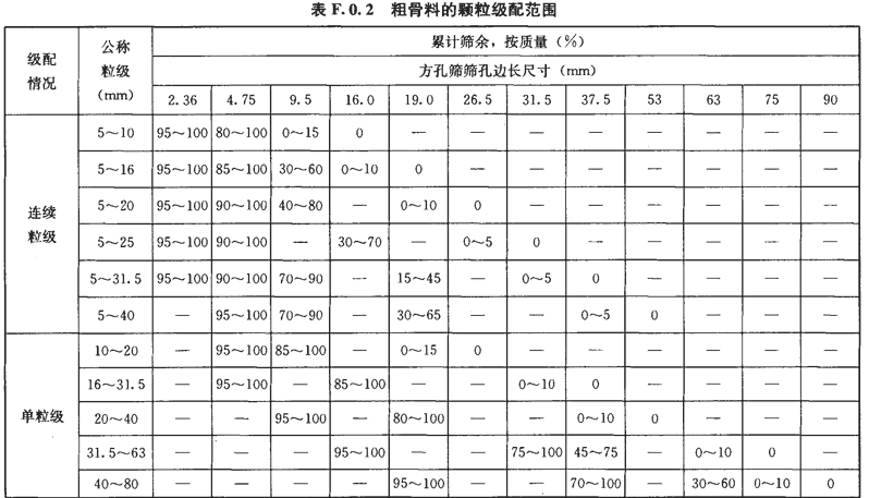 F.0.2 粗骨料的顆粒級配范圍應符合表F.0.2的規(guī)定。