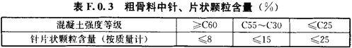F.0.3 粗骨料中針、片狀顆粒含量應符合表F.0.3的規(guī)定。