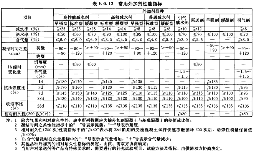 F.0.12 常用外加劑性能指標應符合表F.0.12的規(guī)定。